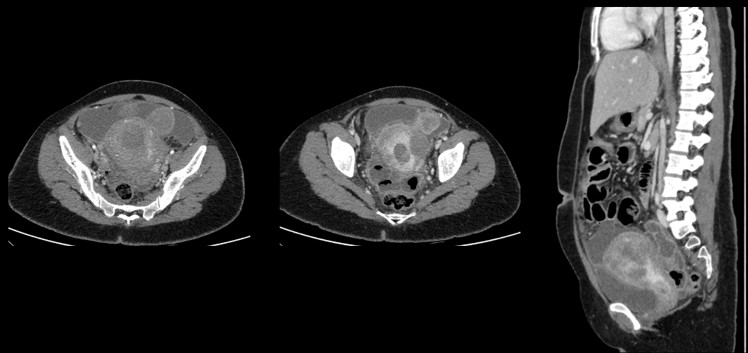 - D. Bulky uterus with a hypodense submucosal lesion protruding into the endometrial cavity from the fundus showing heterogeneous enhancement - infected vs infarcted fibroid. Abnormally enhancing endometrial lining with hypodense content within the endometrial cavity - possible endometritis with pyometra. Pelvic peritonitis with residual trace fluid in the pelvis. Interval resolution of pneumoperitoneum. Abdominal drains in situ.