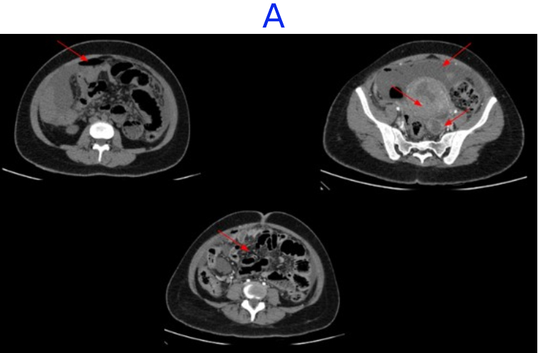 - A. Mild pneumoperitoneum. Few heterogeneously enhancing fibroids seen. Tubular hypodense area in left adnexa - likely pyosalpinx Diffuse greater omental fat stranding and peritoneal thickening - suggestive of peritonitis.