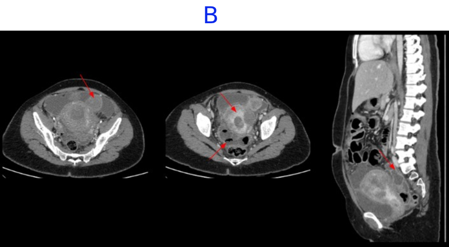 24 year young lady presented with complains of severe abdominal pain predominantly in the lower abdomen. Known case of uterine fibroids. Recently diagnosed with diabetes.