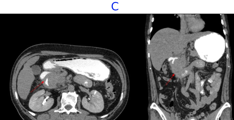 - C. Contrast is seen passing from the duodenum into the jejunum. No contrast leakage noted.